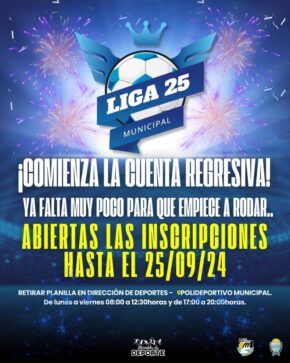 25 de Mayo-Confirmado se abren las inscripciones para el torneo Clausura de la Liga Municipal, están abiertas hasta el 25/09/2024. Por este motivo, les recordamos que deben retirar las planillas en la Dirección de Deportes. Los días de atención son los siguientes: de lunes a viernes de 8:30 a 12 y de 17 a 20 horas.
