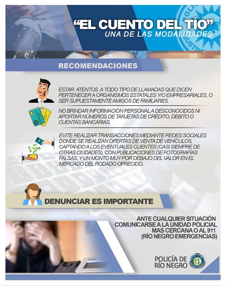 Lamentablemente miles de personas han sido víctimas de distintas estafas y engaños a través de la modalidad conocida como “El cuento del tio”. Estafas telefónicas, por internet, personas que se hacen pasar por consultores, representantes de bancos, etc. Por eso, la Policía de Río Negro difundió una serie de recomendaciones para evitar caer en la trampa de los estafadores.