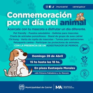 El domingo 28 en el mismo horario (15:00 a 18:00 hs) en plaza Eustaquia Morales (triangulito), jornada por el Día del Animal. Charla, exposición y muestra de accesorios, alimentos para mascotas y “caninata”.