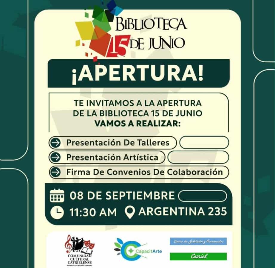 Este lunes 08 de Septiembre se realizará la reapertura de la Biblioteca Popular “15 de Junio”. Presentarán 30 talleres para la comunidad.