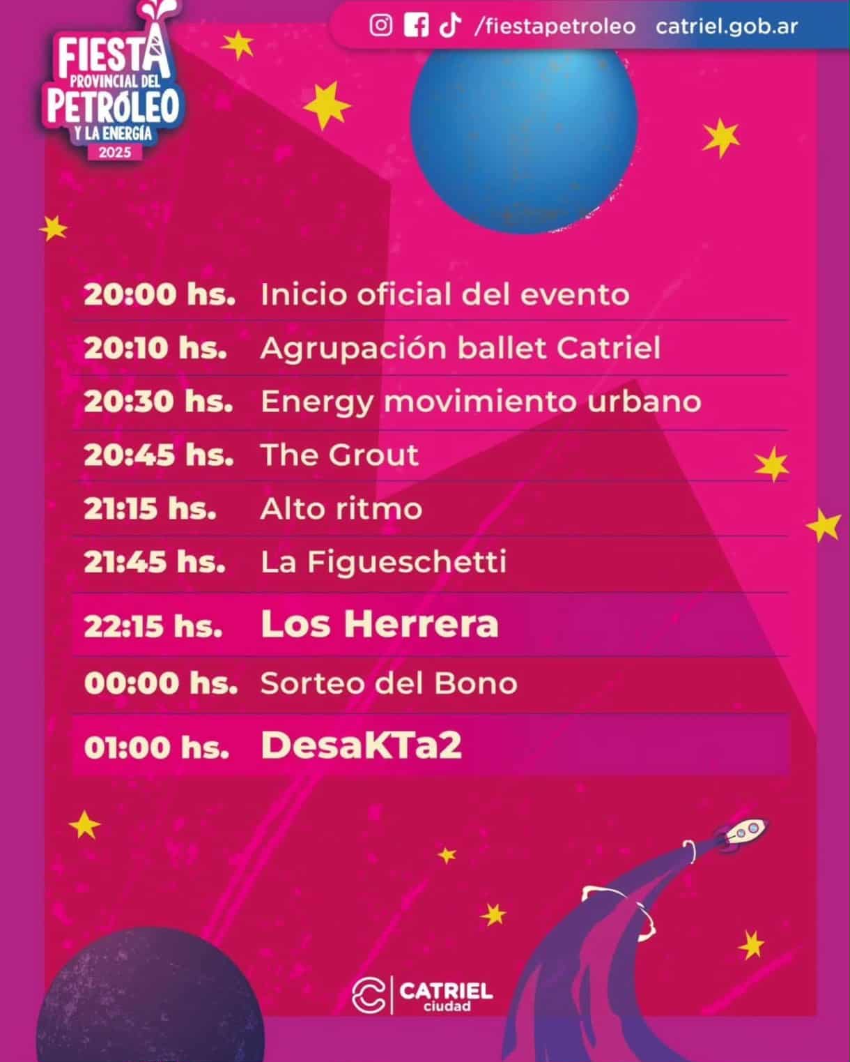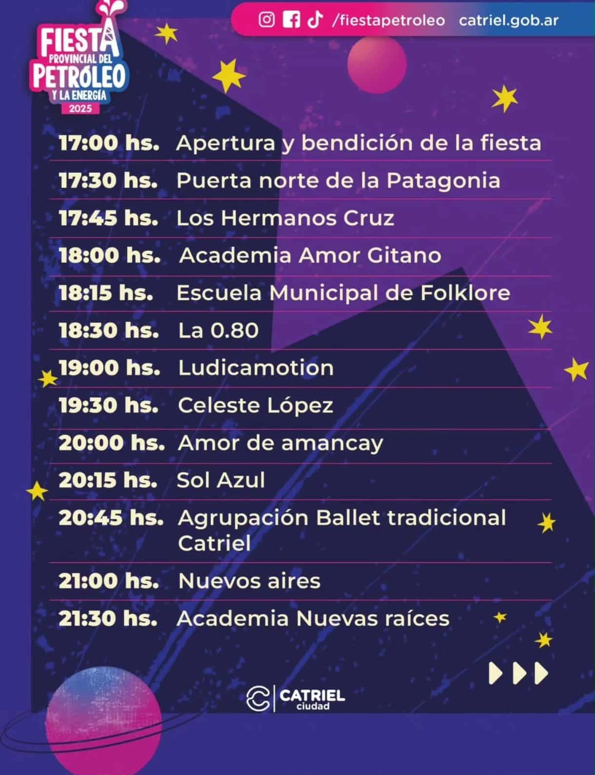 Catriel, Capital Provincial del Petróleo y la Energía, tiene un nutrido programa de actividades para homenajear a los laboriosos petroleros y a sus familias, recordando la fecha (19 de Noviembre de 1.959) cuando desde las entrañas de la tierra en la zona de Catriel Oeste comenzó a brotar el preciado “Oro Negro”, que cambiaría para siempre el paisaje del norte de la Patagonia. Lo que hasta entonces era una pequeña colonia de productores rurales, se transformó en una pujante región petrolera. con un crecimiento demográfico que en poco tiempo comenzó a recibir una multiplicidad de familias provenientes de distintos puntos del País.