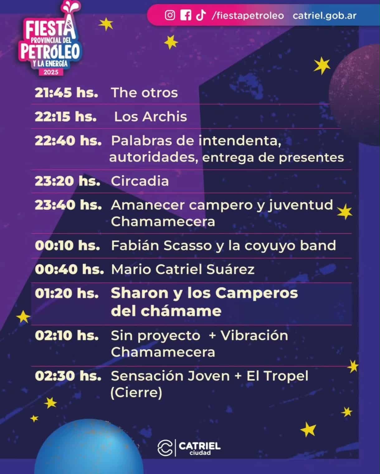 Catriel, Capital Provincial del Petróleo y la Energía, tiene un nutrido programa de actividades para homenajear a los laboriosos petroleros y a sus familias, recordando la fecha (19 de Noviembre de 1.959) cuando desde las entrañas de la tierra en la zona de Catriel Oeste comenzó a brotar el preciado “Oro Negro”, que cambiaría para siempre el paisaje del norte de la Patagonia. Lo que hasta entonces era una pequeña colonia de productores rurales, se transformó en una pujante región petrolera. con un crecimiento demográfico que en poco tiempo comenzó a recibir una multiplicidad de familias provenientes de distintos puntos del País.