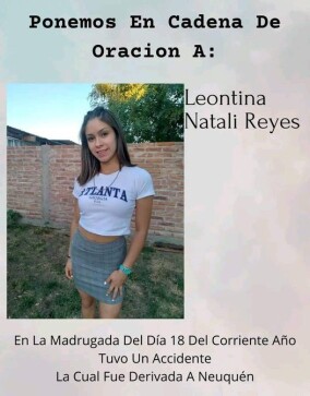 Las comunidades de Puelén (de donde es oriunda) y de 25 de Mayo piden cadena de oración por la vida de Leontina Nataly Reyes (22) internada en Neuquén en terapia intensiva y con pronóstico reservado. Según informaron las autoridades policiales luego del accidente, la mujer y la víctima fatal fueron despedidos del auto al no tener el cinturón de seguridad colocado. Nataly sufrió grave traumatismo de cráneo, fue sometida a una cirugía de alta complejidad y las próximas72 horas son claves para su recuperación..