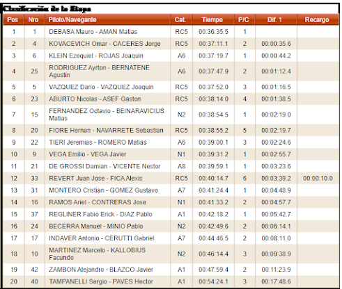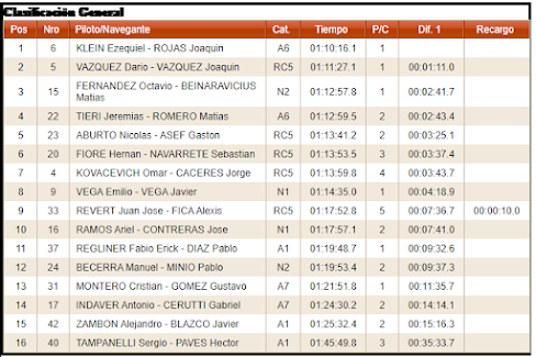 En definitiva, resulto ganador de la general y de la clase A6 Esequiel Klein/Joaquín Rojas; en la RC5 logro su primer victoria Darío y Joaquín Vázquez; en la N1 fue para Emilio y Javier Vega; en la N2 resultó ganador Octavio Fernández/Matías Benaravicius; en la A7 fue para Cristian Montero/Gustavo Gómez; y en la A1 su ganador fue Fabio Regliner/Pablo Diaz.