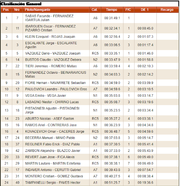 Los ganadores de las categorías participantes en la primera etapa del Rally Integración: en la RC5 Dario y Joaquín Vázquez; en la A6 Facundo Sabas/Julian Fernández Igartua; en la A7 Oscar Ibarguen/Cristian Fernández Pizarro; en la N1 Emilio y Javier VEGA; en la N2 Claudio Bustos/Debora Vázquez; y en la A1 Fabio Erick Regliner/Pablo Diaz.