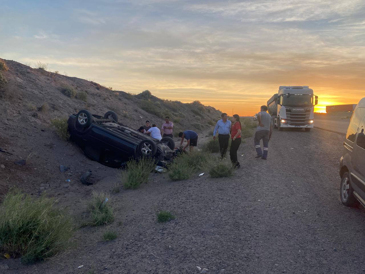 Una Pareja que venía desde Buenos Aires con destino Centenario a visitar familiares, sufrió un vuelco en el kilómetro 90 (a metros del Ingreso yacimiento Entre Lomas). El vehículo, derrapó y volcó.