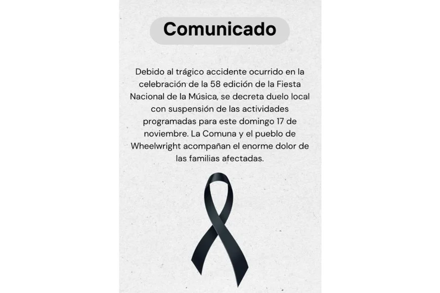 Desde la Comuna emitieron un comunicado donde expresaron que “debido al trágico accidente ocurrido durante la celebración de la 58 edición de la Fiesta Nacional de la Música, se decretó duelo local con suspensión de las actividades programadas para este domingo 17 de noviembre. La comuna y el pueblo de Wheelwright acompañan el enorme dolor de las familias afectadas”.