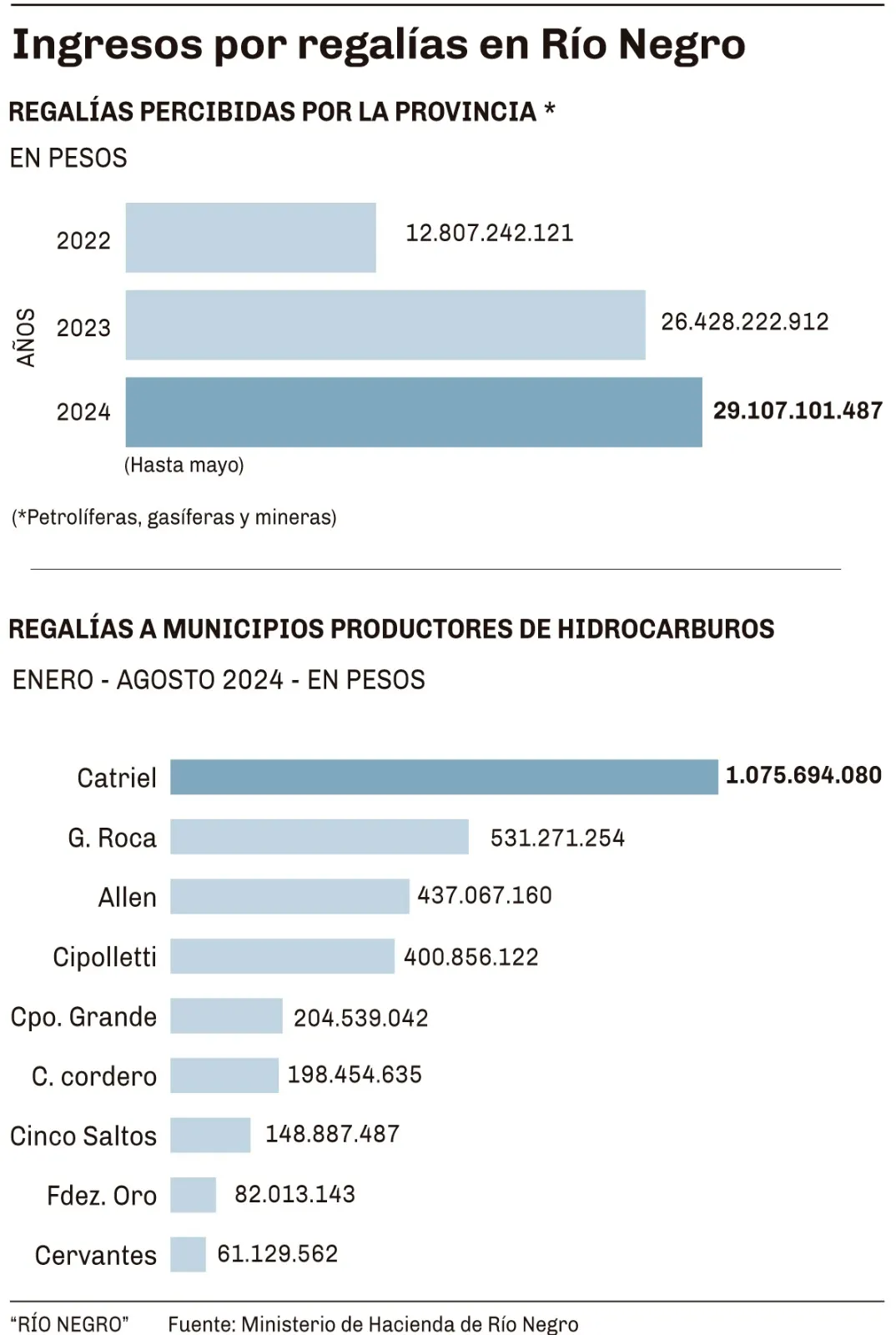 Para el quinto mes del año, Río Negro acumulaba 29.107.101.487 pesos de recursos por regalías, una cifra que superó los ingresos totales del 2023, que en todo el año inyectó 26.128 millones de pesos y duplicó el 2022, cuando la provincia registró ingresos por 12.807 millones de pesos.